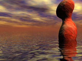 figure and an ambiguous reflective sphere, situated in or floating above water